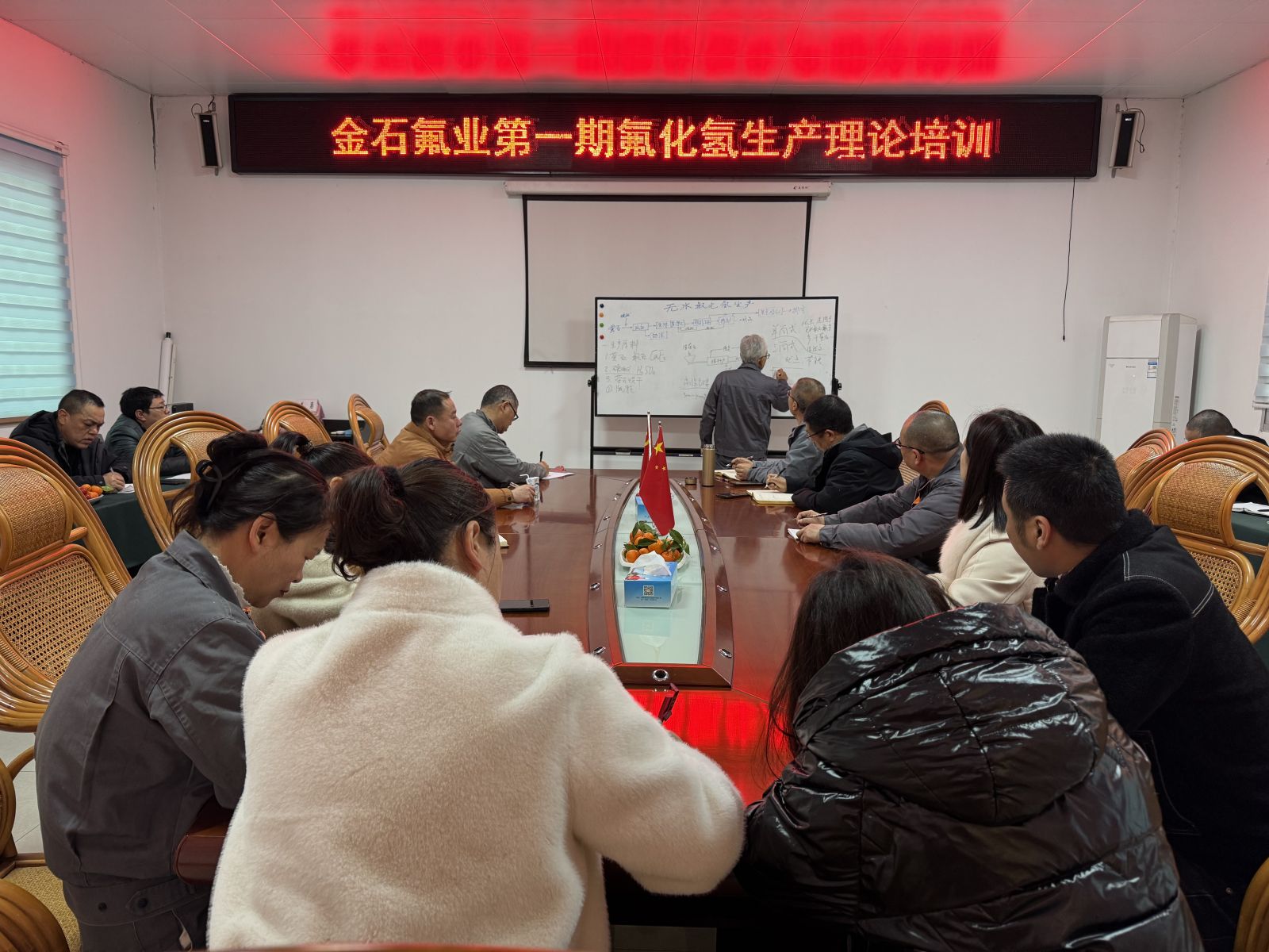 此次培訓(xùn)由在氟化工企業(yè)工作35年的高級(jí)工程師賀志榮授課,主要講解“氟化氫生產(chǎn)理論”等方面的課程,賀工全面、系統(tǒng)地講述了公司產(chǎn)品的相關(guān)原理及在工藝制造過(guò)程中的注意事項(xiàng)和解決方法。